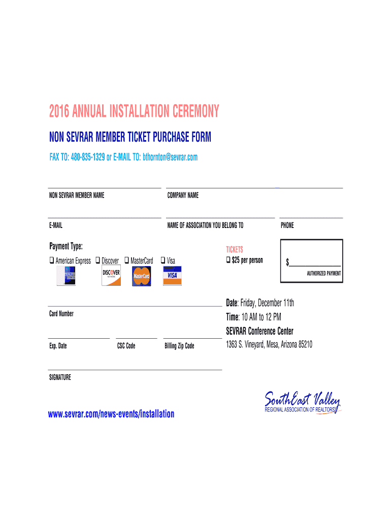 2016 ANNUAL INSTALLATION CEREMONY Date Card Number American Express Discover MasterCard Visa Payment Type: NON SEV RAR MEMBER NAME COMPANY NAME