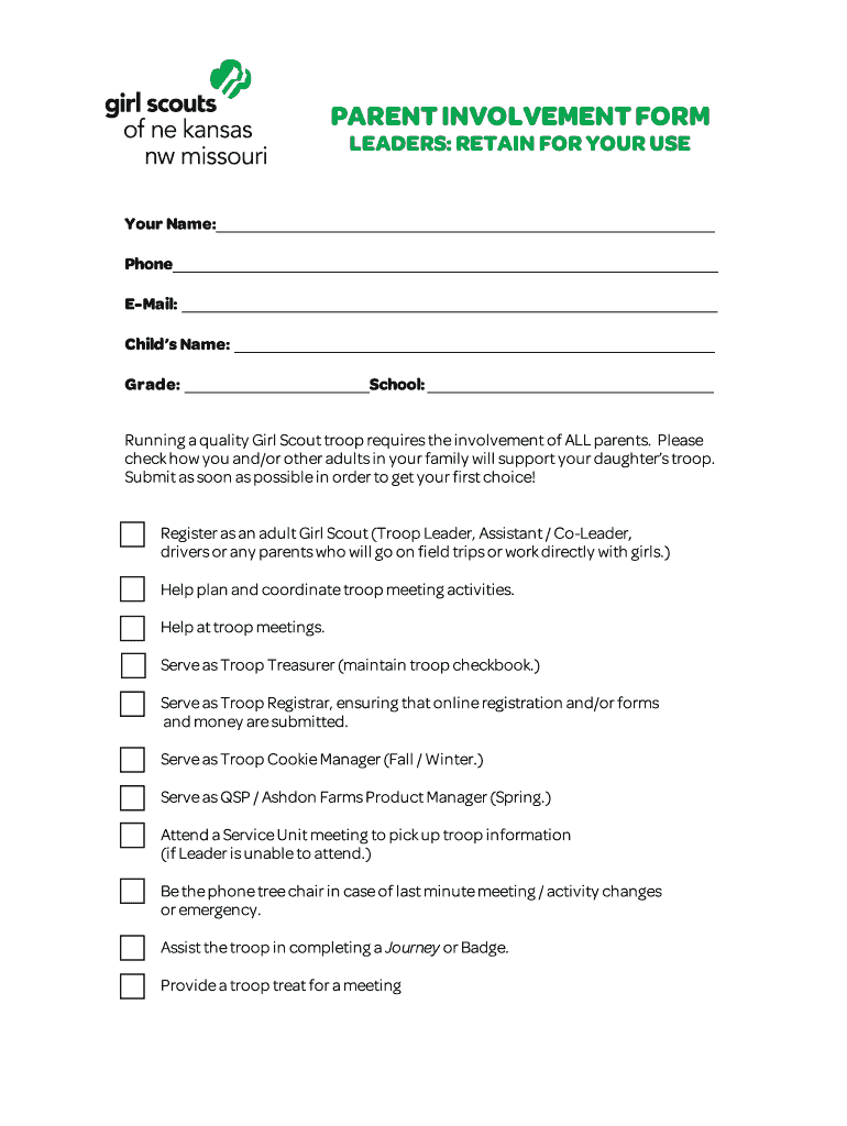 PARENT INVOLVEMENT FORM LEADERS: RETAIN FOR YOUR USE Your Name: Phone Email: Child's Name: Grade: School: Running a quality Girl Scout troop requires the involvement of ALL parents. Please check how