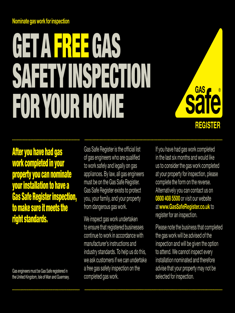 Nominate gas work for inspection Get a free gas safety inspection for your home After you have had gas work completed in your property you can nominate your installation to have a Gas Safe Register