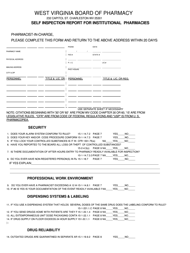This document is a self-inspection report for institutional pharmacies in West Virginia. It is intended for the pharmacist-in-charge to complete and return to the West Virginia Board of Pharmacy within