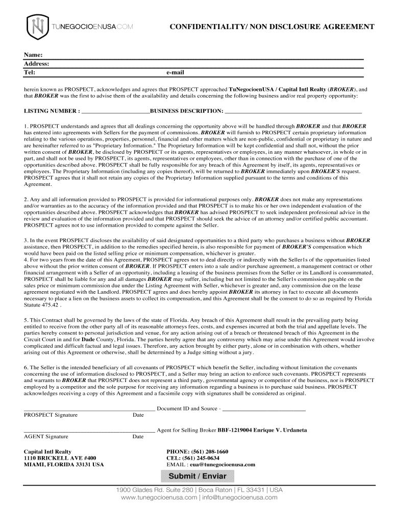 CONFIDENTIALITY/ NON DISCLOSURE AGREEMENT Name: Address: Tel: email herein known as PROSPECT, acknowledges and agrees that PROSPECT approached TuNegocioenUSA / Capital Into Realty (BROKER), and that