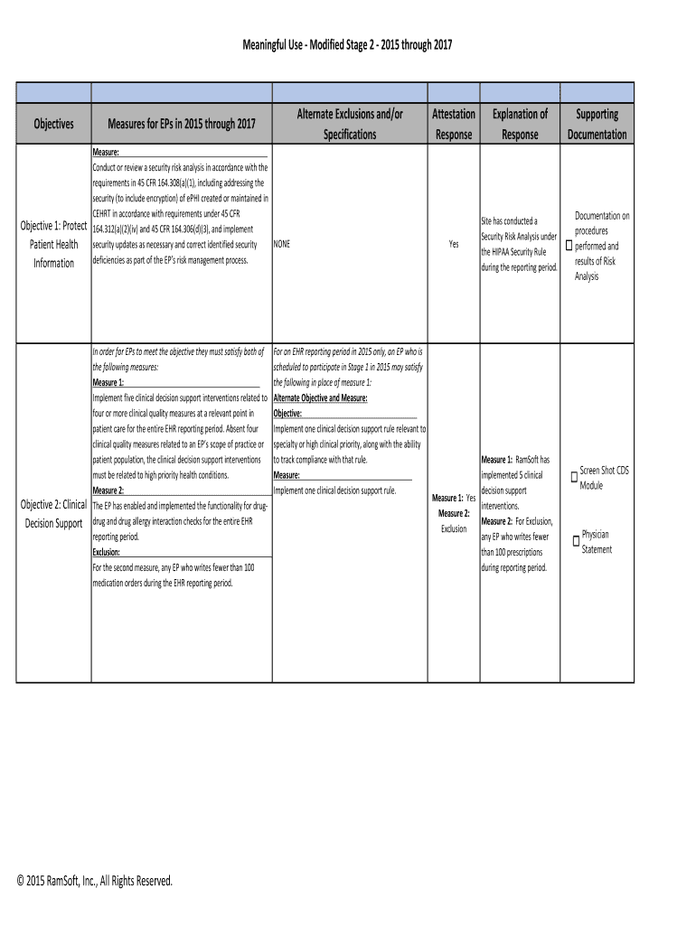 Meaningful Use Modified Stage 2 2015 through 2017ObjectivesObjective 1: Protect Patient Health InformationObjective 2: Clinical Decision SupportAlternate Exclusions and/or SpecificationsMeasures for