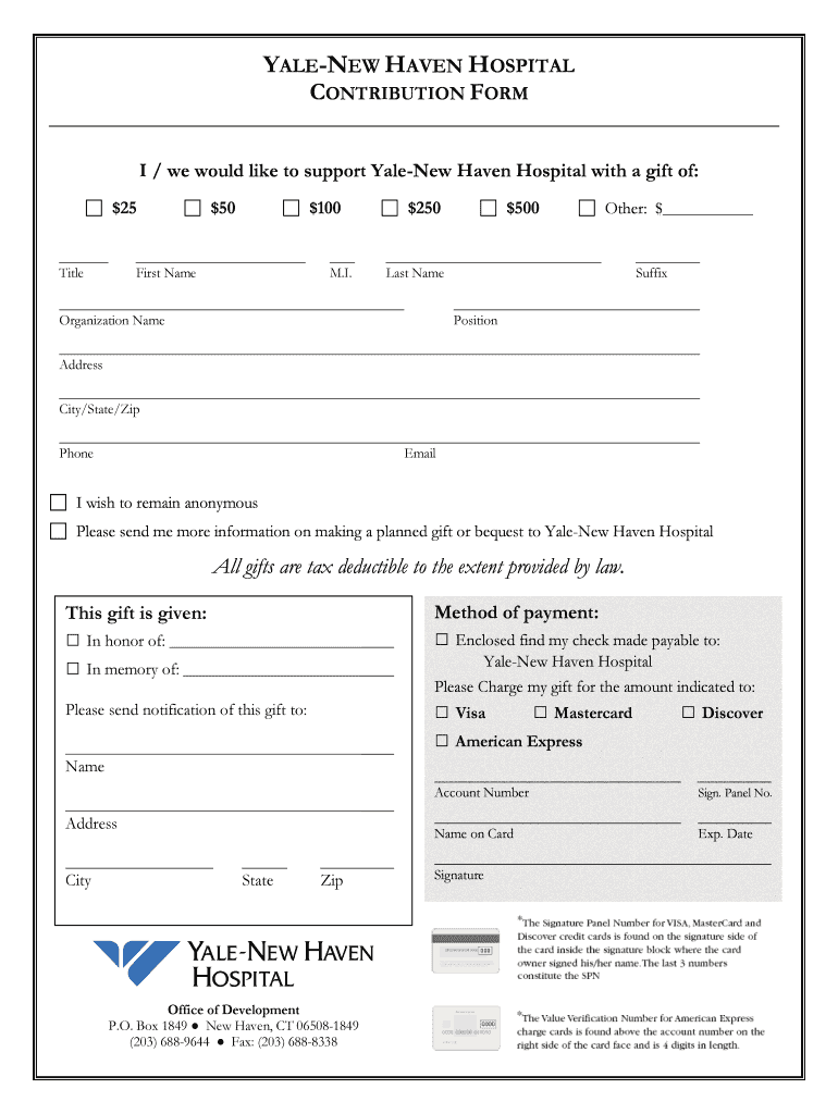 The Yale-New Haven Hospital Contribution Form is a donation document used by individuals to contribute funds to the hospital.