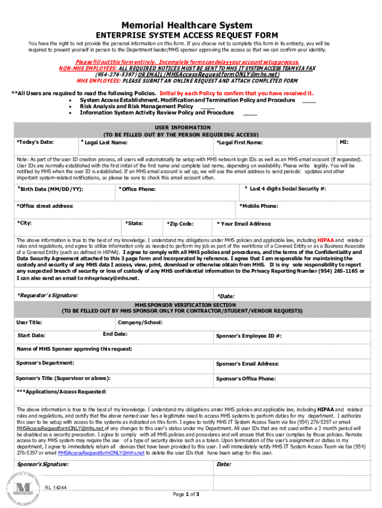 Get the free Enterprise System Access Request Form - Memorial Healthcare ...