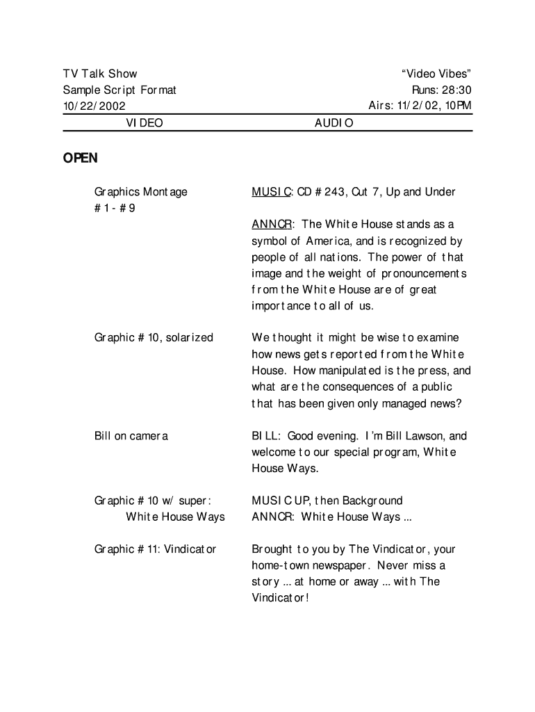 TV Talk Show Sample Script Format 10/22/2002 VIDEOVideo Vibes Runs: 28:30 Airs: 11/2/02, 10PM AUDIOTAPE Graphics Montage #1 #9MUSIC: CD #243, Cut 7, Up and Ideographic #10, solarized thought it might