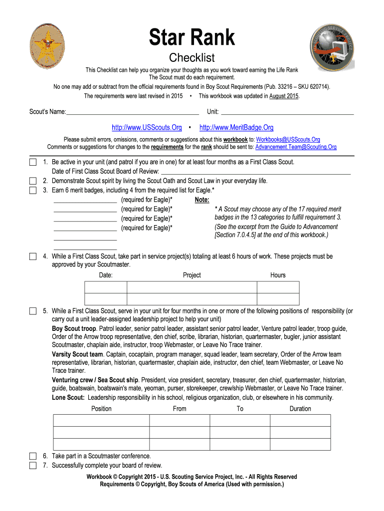 Star Rank Checklist This Checklist can help you organize your thoughts as you work toward earning the Life Rank The Scout must do each requirement. No one may add or subtract from the official requirements