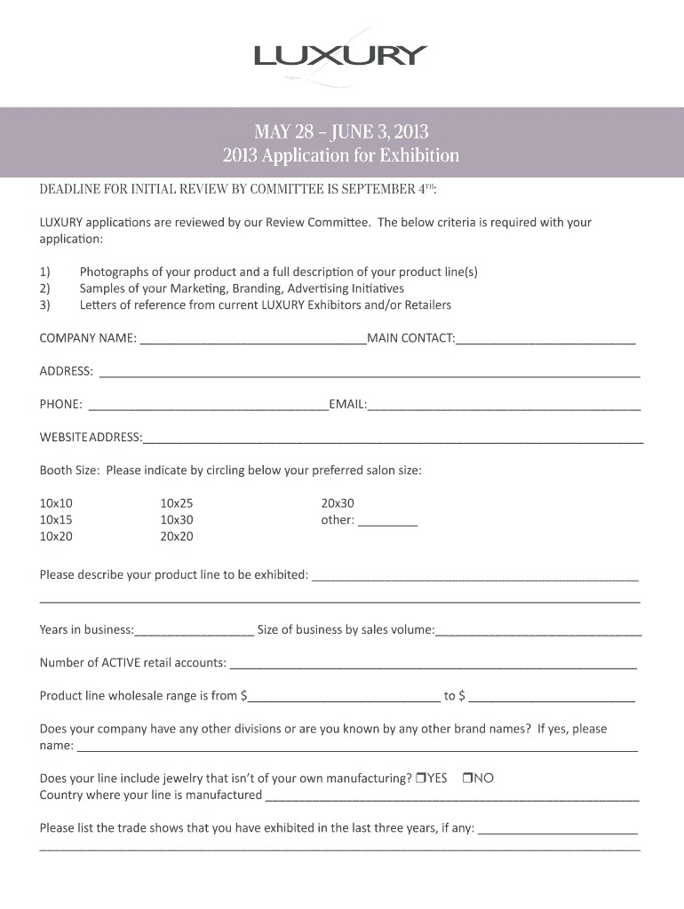 MAY 28 JUNE 3, 2013 2013 Application for Exhibition DEADLINE FOR INITIAL REVIEW BY COMMITTEE IS SEPTEMBER 4TH: LUXURY applications are reviewed by our Review Committee. The below criteria is required