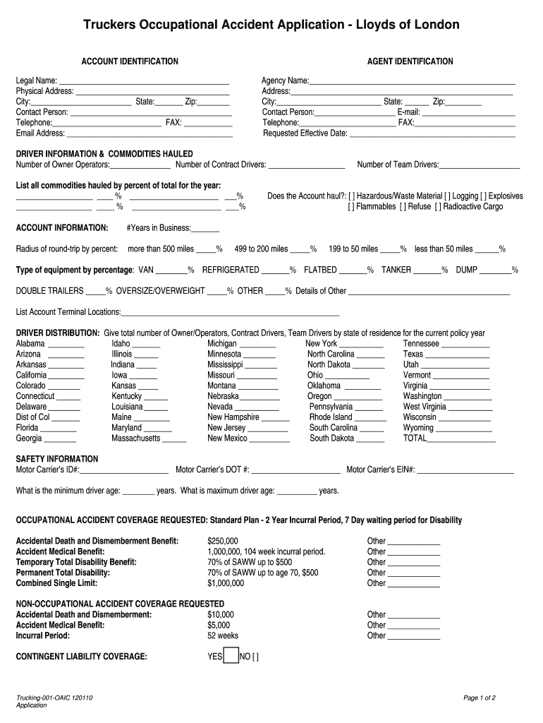 Truckers Occupational Accident Application Lloyd's of London ACCOUNT IDENTIFICATION AGENT IDENTIFICATION Legal Name: Physical Address: City: State: Zip: Contact Person: Telephone: FAX: Email Address: