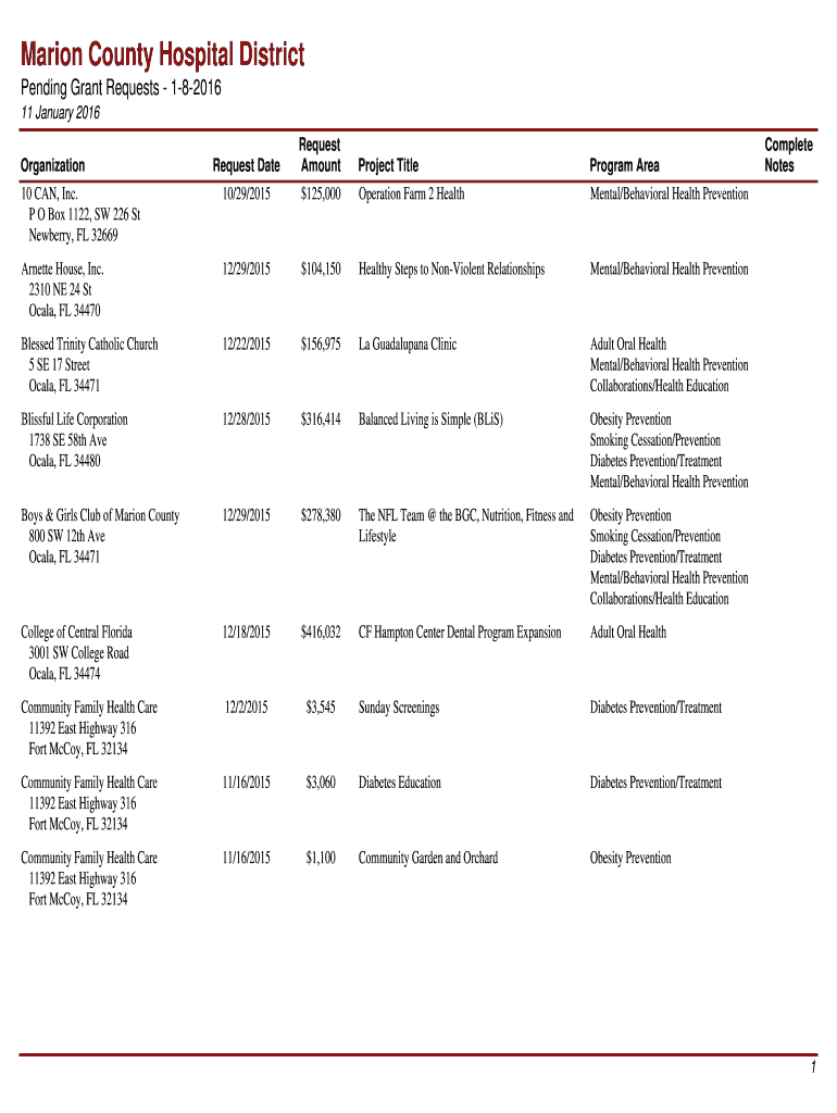 Marion County Hospital District Pending Grant Requests 182016 11 January 2016 Request DateRequest AmountProject TitleProgram Area10 CAN, Inc. P O Box 1122, SW 226 St Newberry, FL 3266910/29/$2015125,000Operation