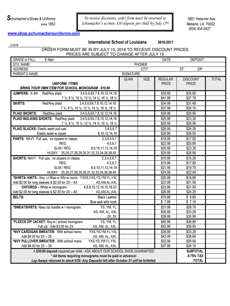 Schumacher Shoes & Uniforms since 1852 To receive discounts, order form must be returned to Schumacher w/min. $30 deposit per child by July 15th 3601 Lesser Ave. Metairie, LA. 70002 (504) 4540427