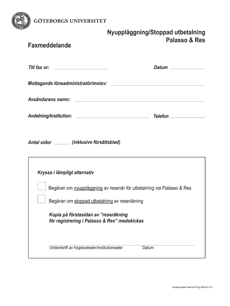 Nyupplggning/Stopped utbetalning Pa lasso & Res Till fax NR: Datum GOTEBORG UNIVERSITY Nyupplstoppad utbetFar & Flag 20040213 LL Mottagande ...
