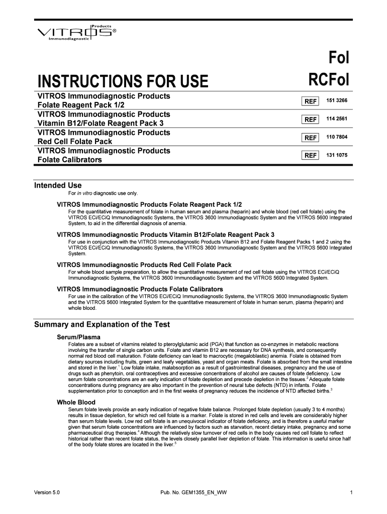 This document provides instructions on the use of VITROS Immunodiagnostic Products for the quantitative measurement of folate in various human specimens, detailing the intended use, testing procedures,