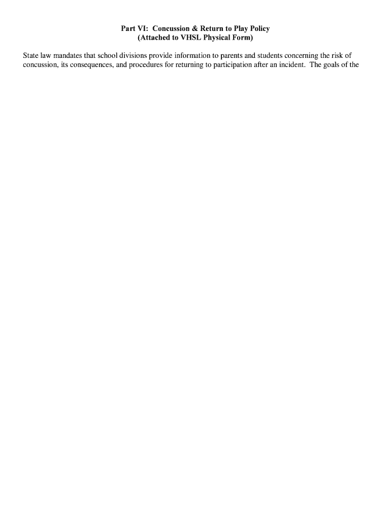 Part VI: Concussion & Return to Play Policy (Attached to HSL Physical Form) State law mandates that school divisions provide information to parents and students concerning the risk of concussion,