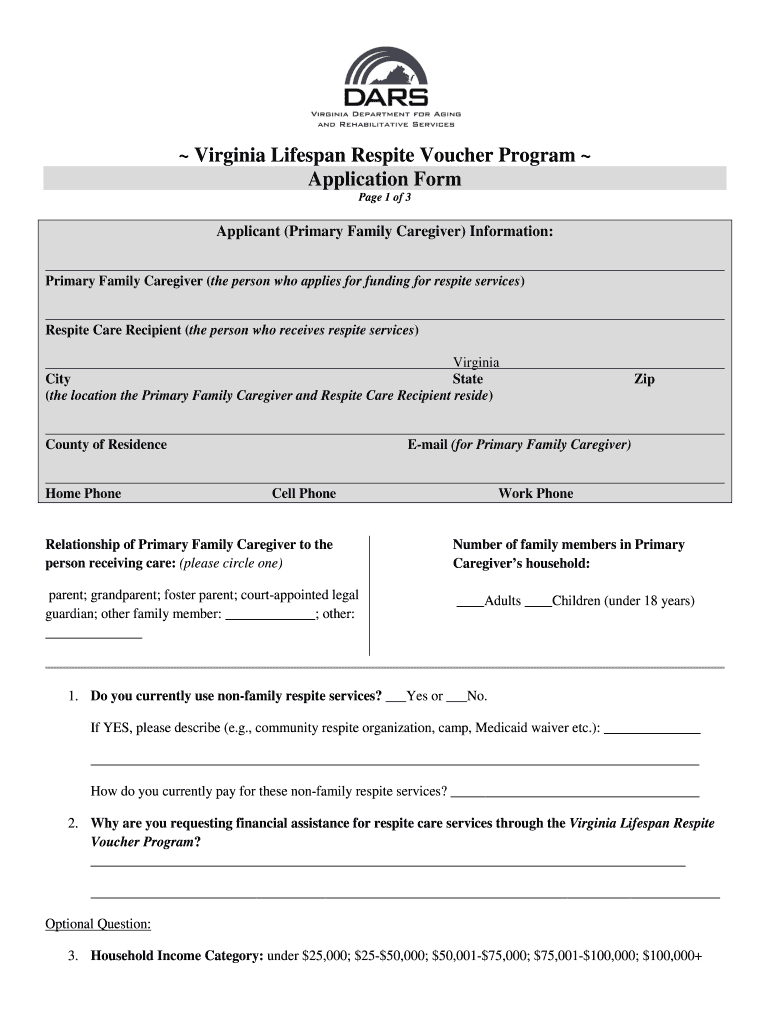 Virginia Lifespan Respite Voucher Program Application Form Page 1 of 3 Applicant (Primary Family Caregiver) Information: Primary Family Caregiver (the person who applies for funding for respite services)