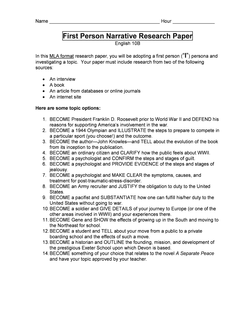 Name Hour First-Person Narrative Research Paper English 10B In this MLA format research paper, you will be adopting a first person (I) persona and investigating a topic. Your paper must include research