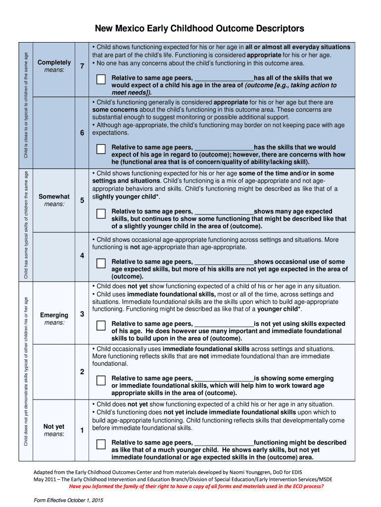 New Mexico Early Childhood Outcome Descriptors Child does not yet demonstrate skills typical of other children his or her age Child has some typical skills of children the same age Child is close