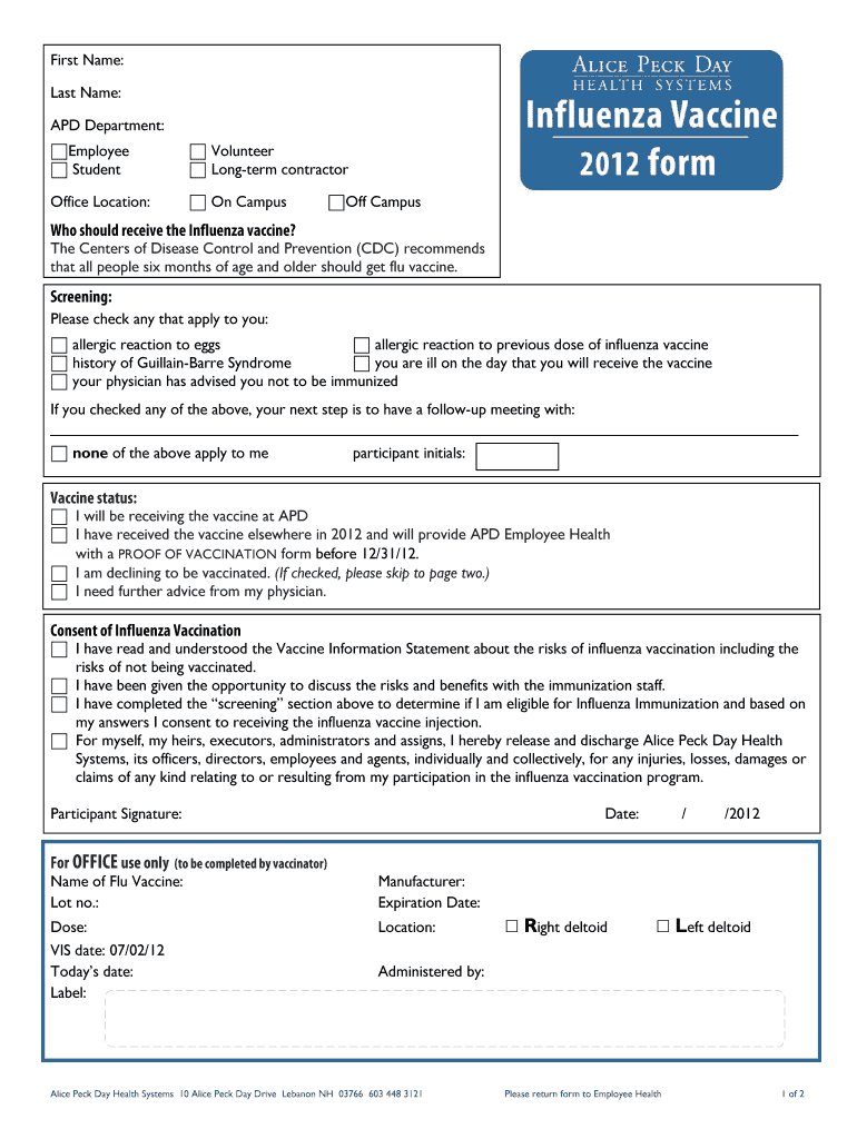 The Influenza Vaccination Consent Form is specifically for employees and volunteers at Alice Peck Day Health Systems. Participants should meet health screening criteria defined by the health system.