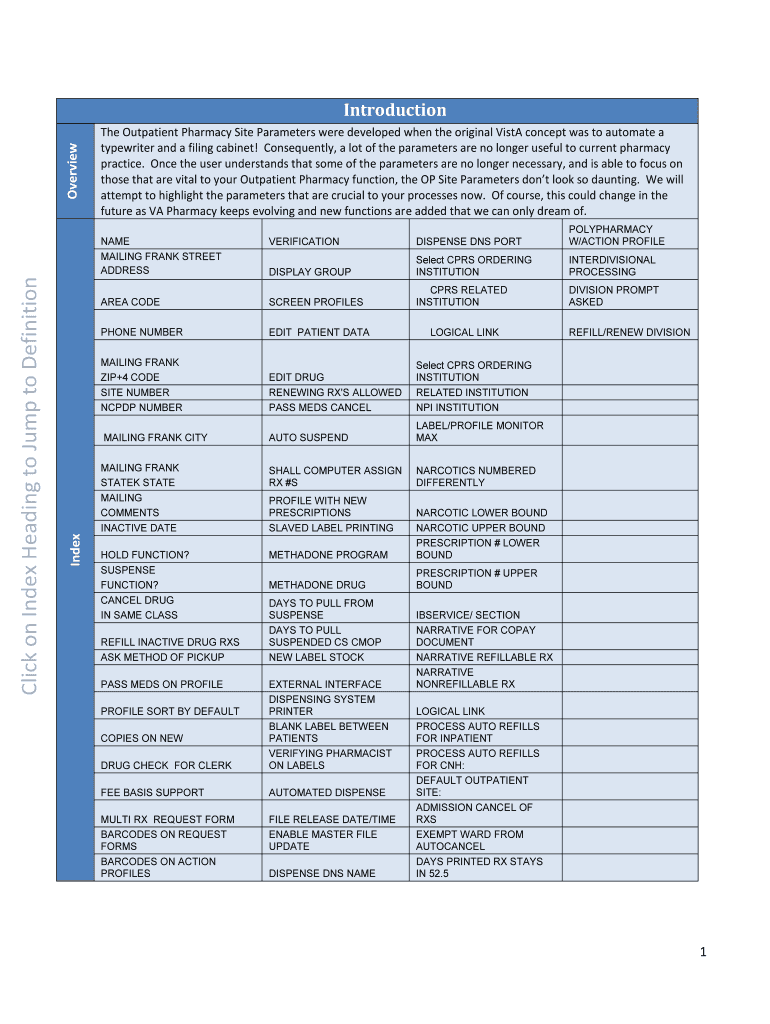 Overview Top Introduction The Outpatient Pharmacy Site Parameters were developed when the original Vista concept was to automate a typewriter and a filing cabinet! Consequently, a lot of the parameters