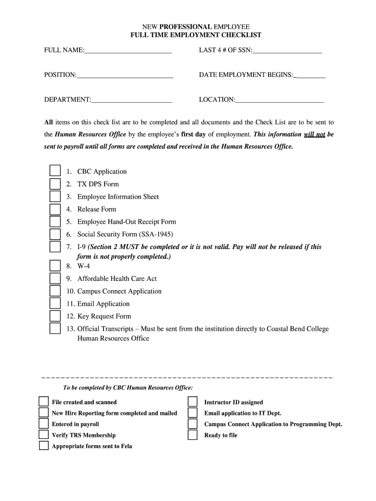 Get the free NEW PROFESSIONAL EMPLOYEE FULL TIME EMPLOYMENT CHECKLIST - coastalbend