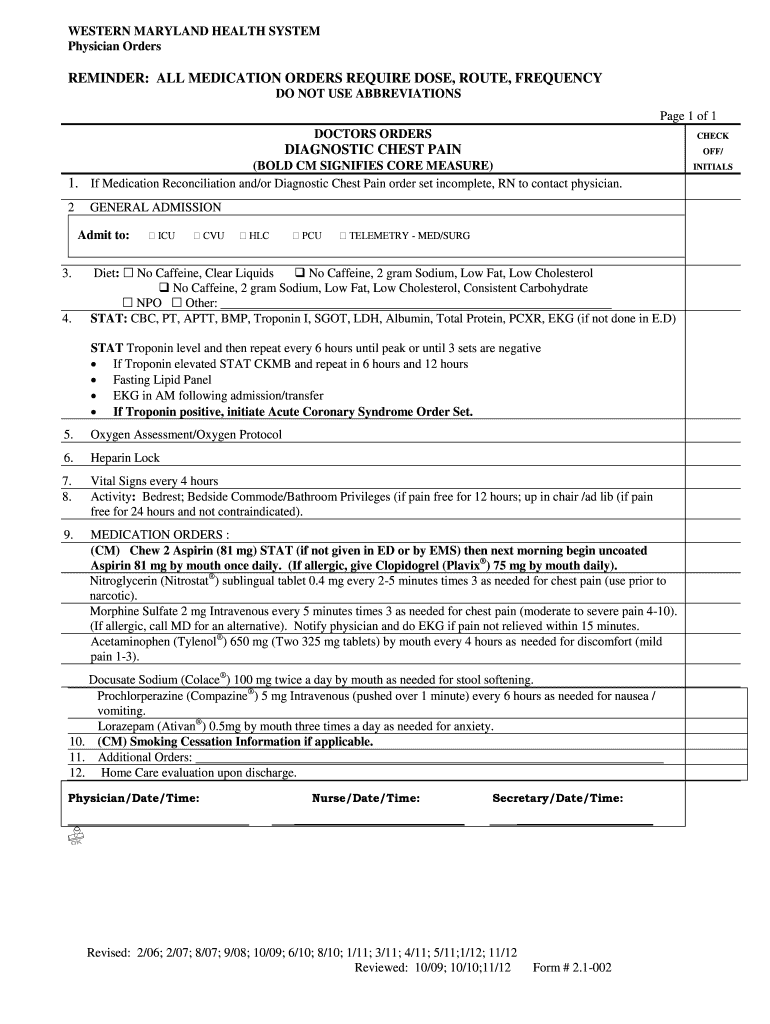 WESTERN MARYLAND HEALTH SYSTEM Physician Orders REMINDER: ALL MEDICATION ORDERS REQUIRE DOSE, ROUTE, FREQUENCY DO NOT USE ABBREVIATIONS Page 1 of 1 DOCTORS ORDERS CHECK DIAGNOSTIC CHEST PAIN OFF/