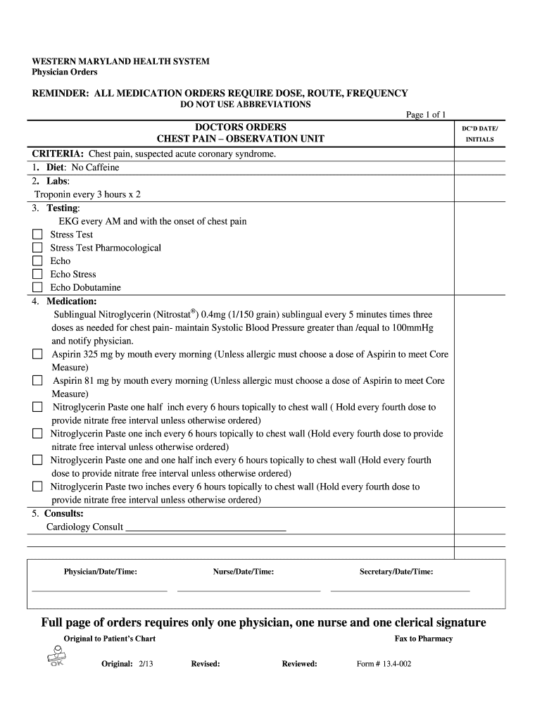 WESTERN MARYLAND HEALTH SYSTEM Physician Orders REMINDER: ALL MEDICATION ORDERS REQUIRE DOSE, ROUTE, FREQUENCY DO NOT USE ABBREVIATIONS Page 1 of 1 DOCTORS ORDERS CHEST PAIN OBSERVATION UNIT CRITERIA: