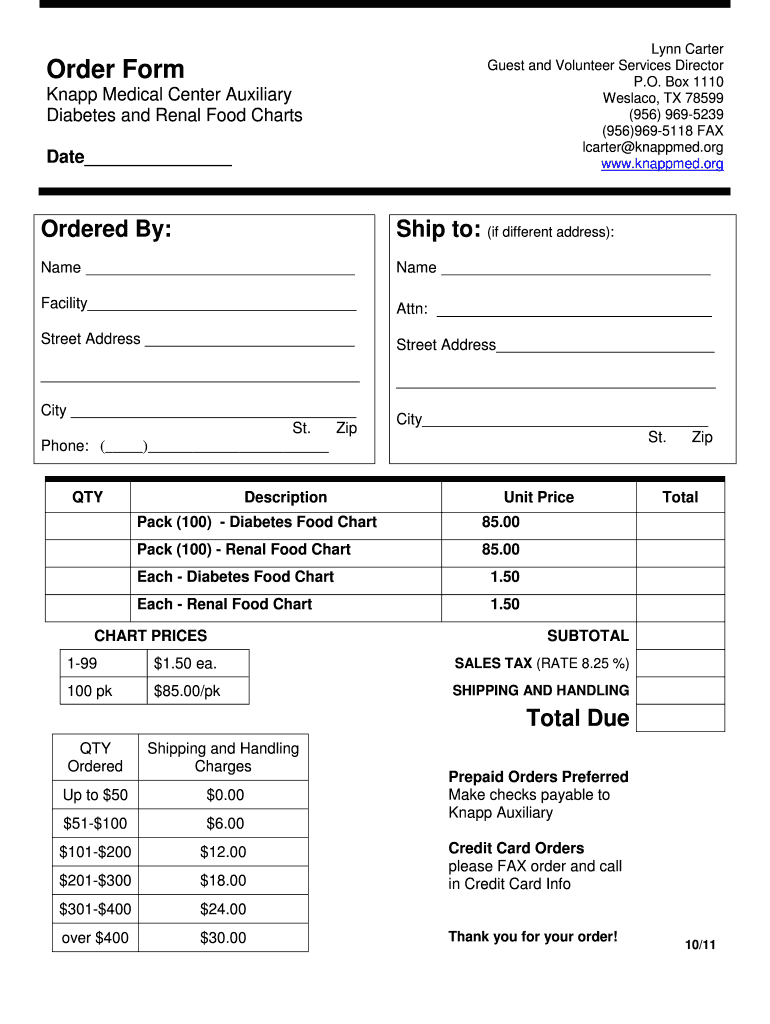 Order Form Knapp Medical Center Auxiliary Diabetes and Renal Food Charts Date Lynn Carter Guest and Volunteer Services Director P.O. Box 1110 Wesley, TX 78599 (956) 969-5239 (956)969-5118 FAX Carter