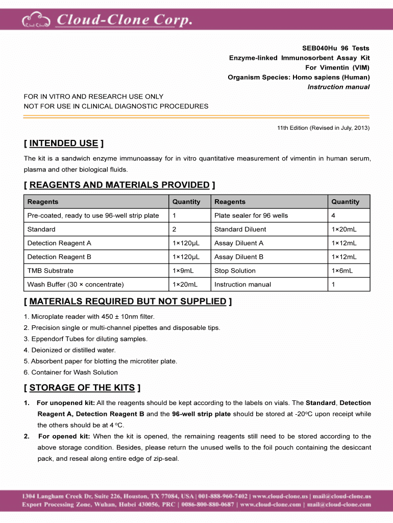 Get the free ELISA Kit for Vimentin VIM Instruction manual Catalog NoSEB040Hu