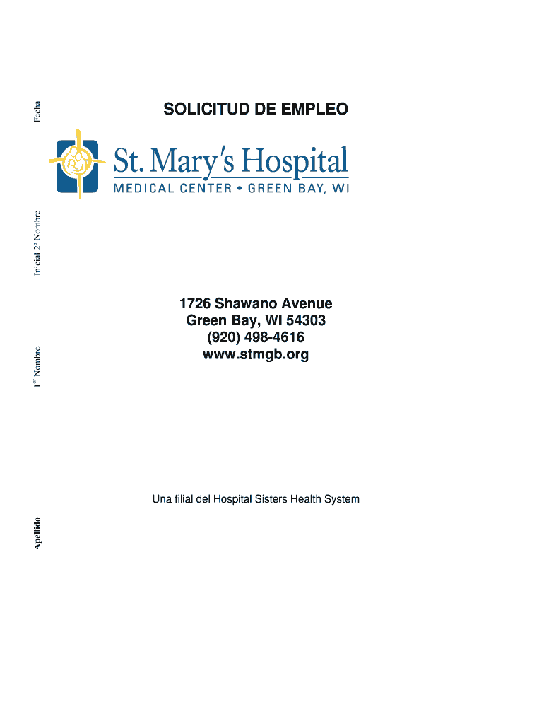 Este documento es una solicitud de empleo para el St. Mary’s Hospital Medical Center, que incluye instrucciones para completar la solicitud, información personal, historial de empleo y un compromiso