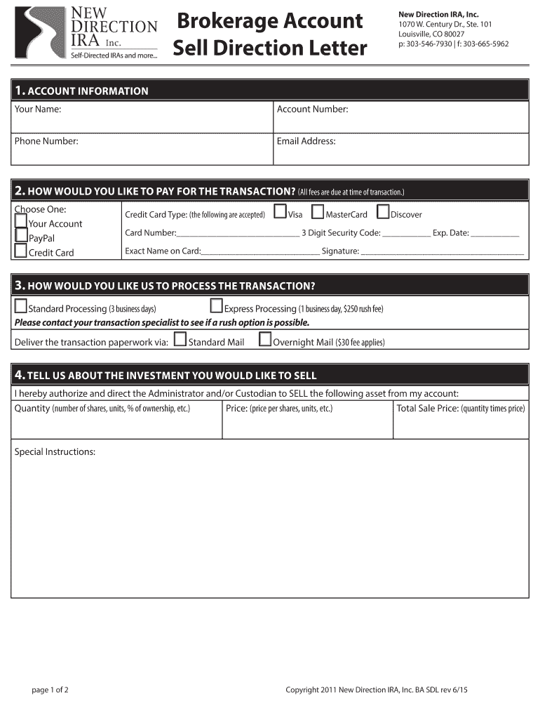 Brokerage Account Sell Direction Letter New Direction IRA, Inc. 1070 W. Century Dr., Ste. 101 Louisville, CO 80027 p: 3035467930 f: 3036655962 1. ACCOUNT INFORMATION Your Name: Account Number: Phone
