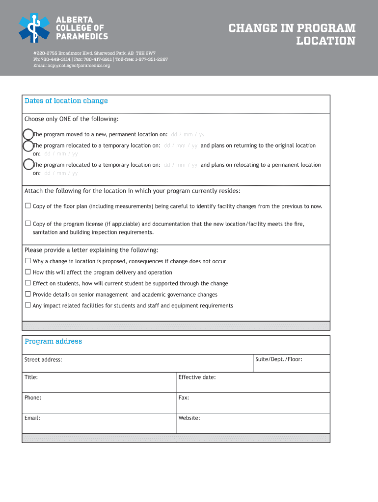 CHANGE IN PROGRAM LOCATION #2202755 Broadmoor Blvd. Sherwood Park, AB T8H 2W7 pH: 7804493114 Fax: 7804176911 Toll free: 18773512267 Email: ACP collegeofparamedics.org Dates of location change Choose