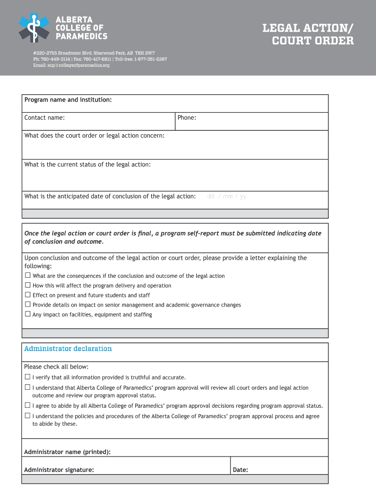 LEGAL ACTION/ COURT ORDER #2202755 Broadmoor Blvd. Sherwood Park, AB T8H 2W7 pH: 7804493114 Fax: 7804176911 Toll free: 18773512267 Email: ACP collegeofparamedics.org Program name and institution:
