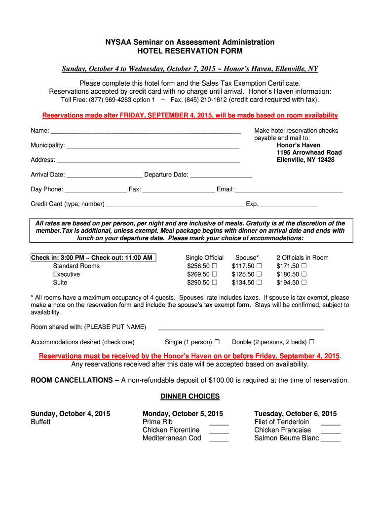 NY SAA Seminar on Assessment Administration HOTEL RESERVATION FORM Sunday, October 4 to Wednesday, October 7, 2015, Honors Haven, Belleville, NY Please complete this hotel form and the Sales Tax Exemption