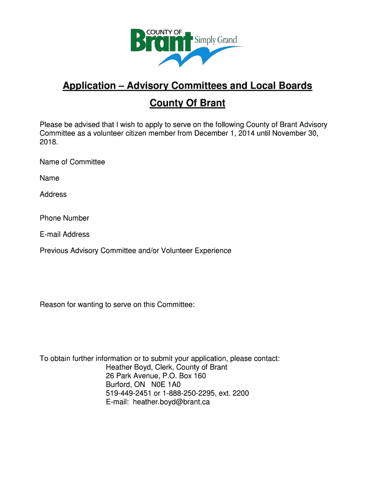 Application Advisory Committees and Local Boards County Of Brant Please be advised that I wish to apply to serve on the following County of Brant Advisory Committee as a volunteer citizen member from