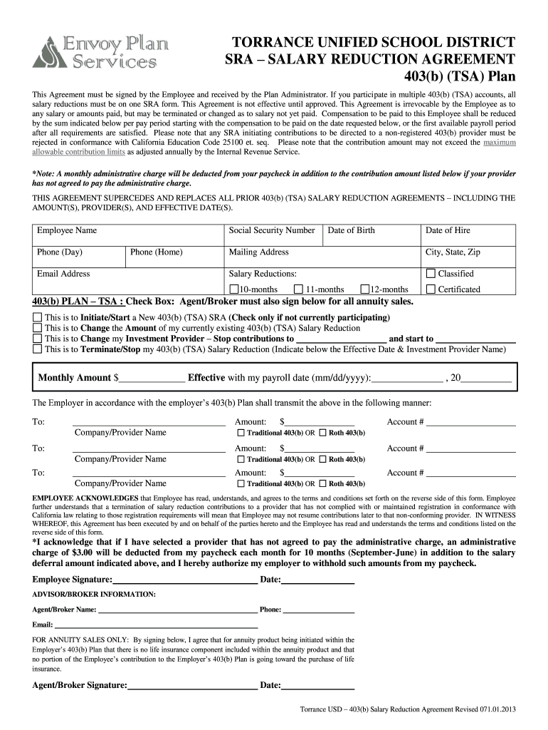 TORRANCE UNIFIED SCHOOL DISTRICT SRA SALARY REDUCTION AGREEMENT 403(b) (TSA) Plan This Agreement must be signed by the Employee and received by the Plan Administrator. If you participate in multiple