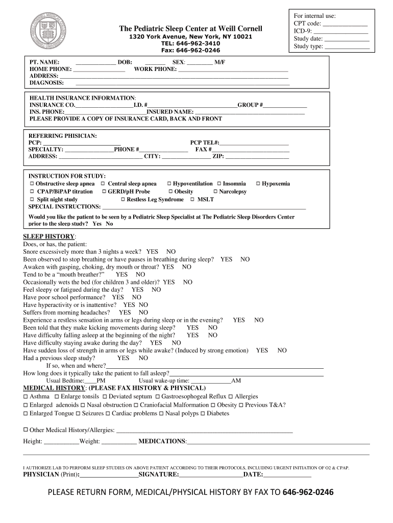The Pediatric Sleep Study Referral Form is a crucial document in healthcare, facilitating referrals to The Pediatric Sleep Center at Weill Cornell. This form plays a significant role in collecting accurate patient information necessary for sleep studies. It is an essential element of patient registration and intake, ensuring that healthcare providers gather all pertinent details for effective care.