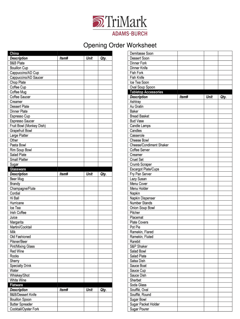 Opening Order Worksheet China Description B&B Plate Bouillon Cup Cappuccino/AD Cup Cappuccino/AD Saucer Chop Plate Coffee Cup Coffee Mug Coffee Saucer Creamer Dessert Plate Dinner Plate Espresso Cup
