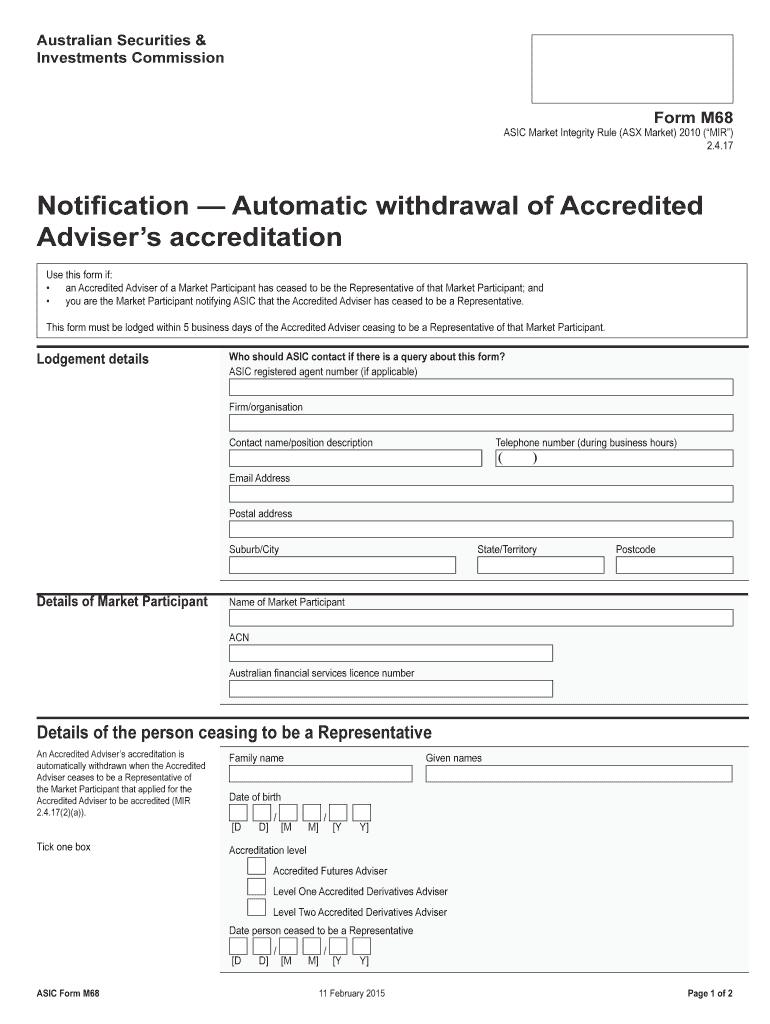 Australian Securities & Investments Commission Form M68 ASIC Market Integrity Rule (ASX Market) 2010 (MIR) 2.4.17 Notification Automatic withdrawal of Accredited Advisers' accreditation Use this form