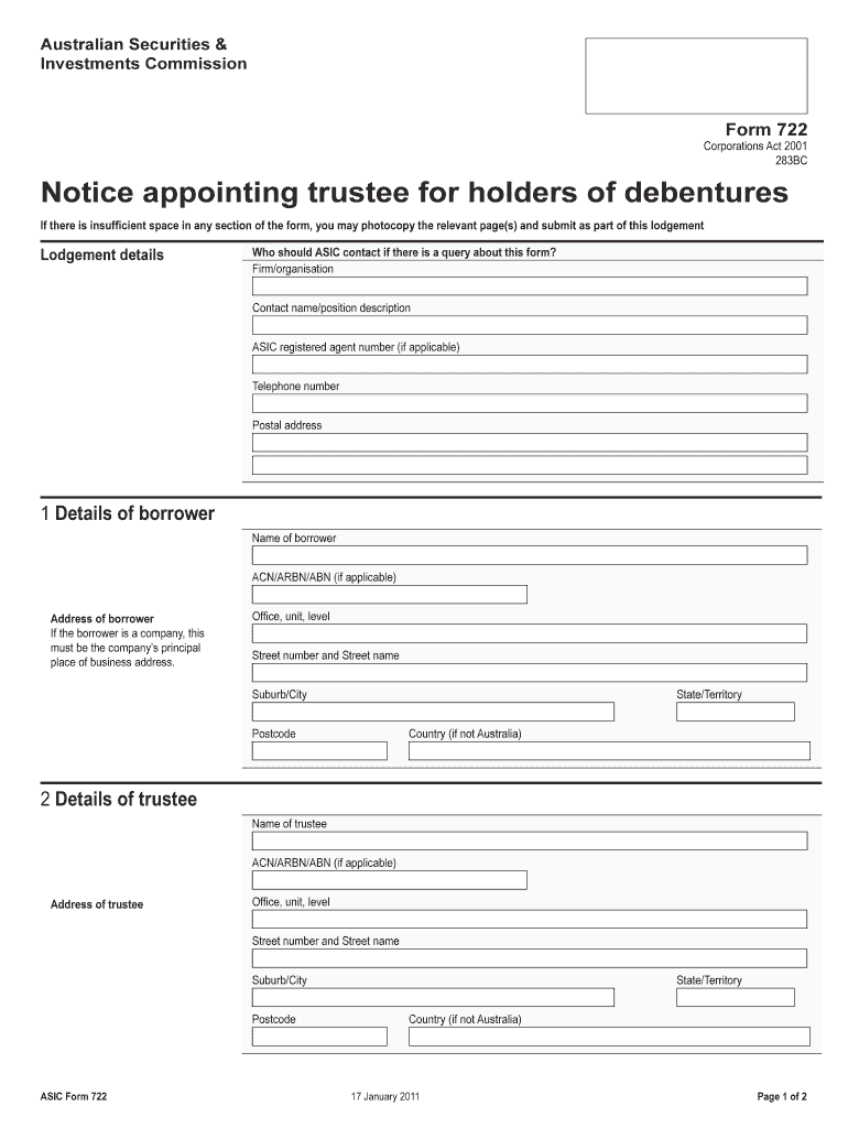 Australian Securities & Investments Commission Form 722 Corporations Act 2001 283BC Notice appointing trustee for holders of debentures If there is insufficient space in any section of the form, you