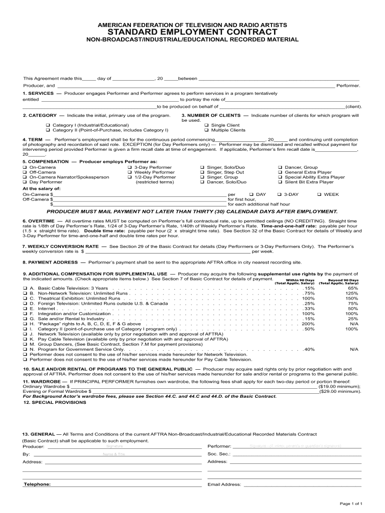 AMERICAN FEDERATION OF TELEVISION AND RADIO ARTISTS STANDARD EMPLOYMENT CONTRACT BROADCAST/INDUSTRIAL/EDUCATIONAL RECORDED MATERIAL This Agreement made this day of, 20 between Producer, and Performer.