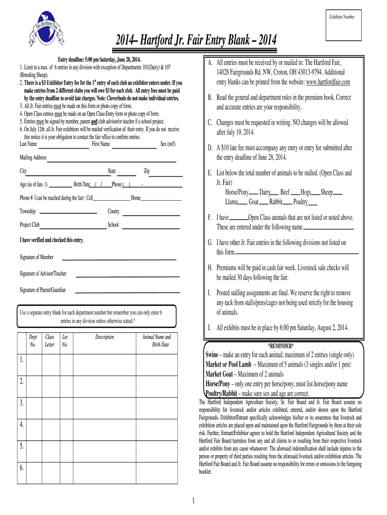 Exhibitor Number 2014 Hartford Jr. Fair Entry Blank 2014 Entry deadline: 5:00 pm Saturday, June 28, 2014. 1. Limit to a max. of 6 entries in any division with exception to Departments 101(Dairy) &