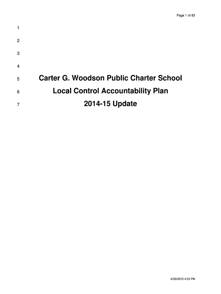 Page 1 of 83 1 2 3 4 5 Carter G. Woodson Public Charter School 6 Local Control Accountability Plan 7 201415 Update 6/30/2015 4:33 PM Page 2 of 83 15497.5. Local Control and Accountability Plan and