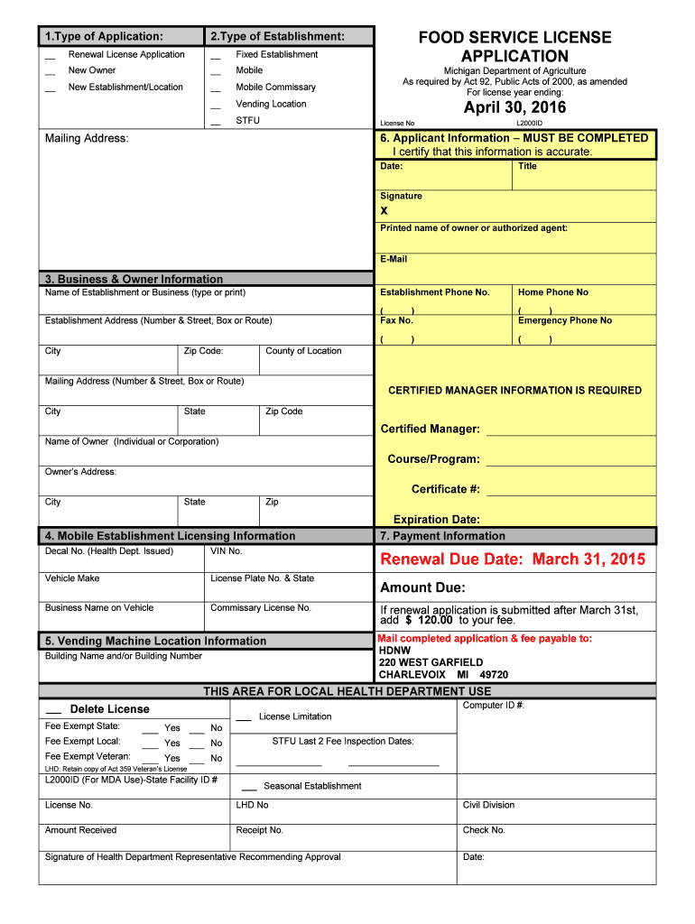 1. Type of Application: Renewal License Application Fixed Establishment New Owner Mobile New Establishment/Location Mobile Commissary Vending Location FOOD SERVICE LICENSE APPLICATION 2. Type of Establishment: