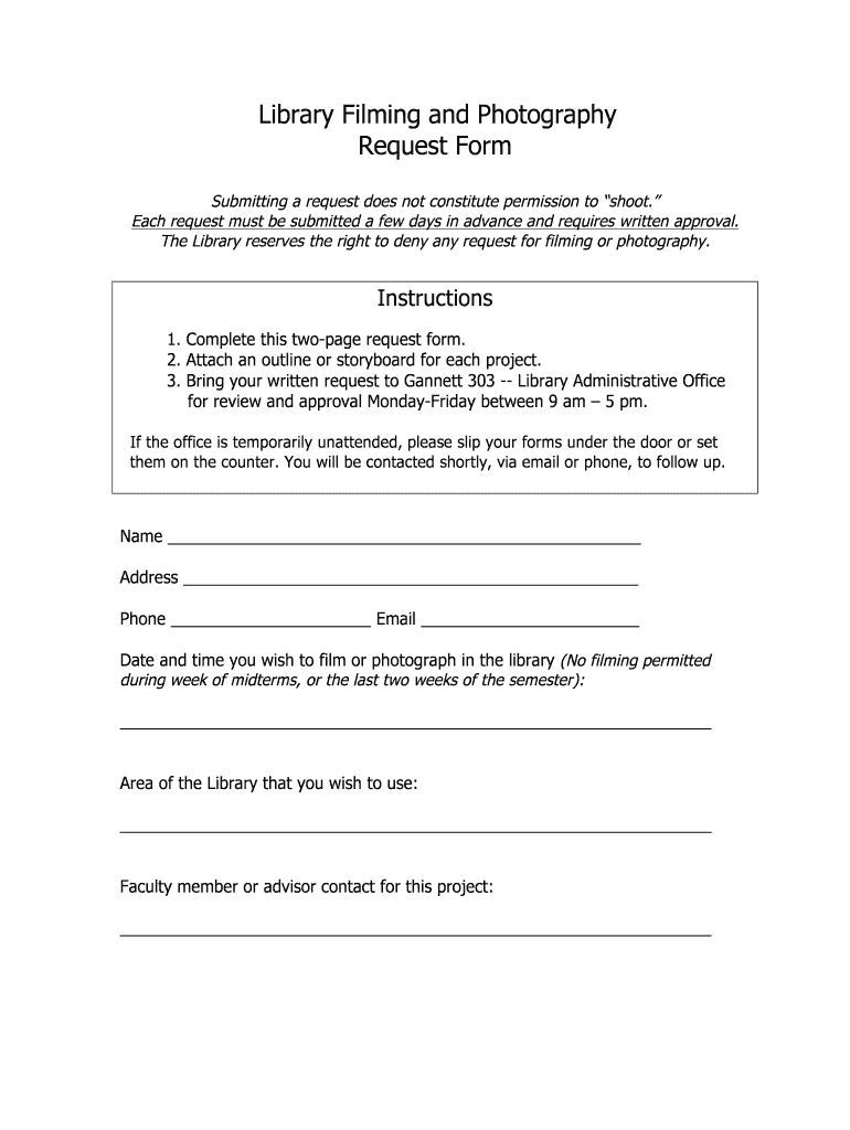 Library Filming and Photography Request Form Submitting a request does not constitute permission to shoot. Each request must be submitted a few days in advance and requires written approval. The Library