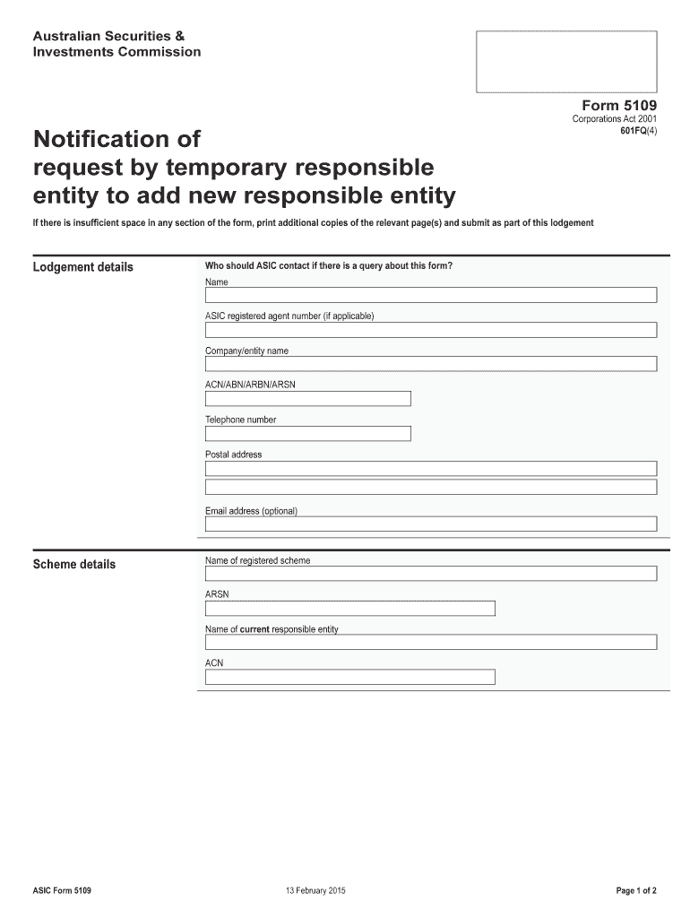 Australian Securities & Investments Commission Form 5109 Notification of request by temporary responsible entity to add new responsible entity Corporations Act 2001 601FQ(4) If there is insufficient
