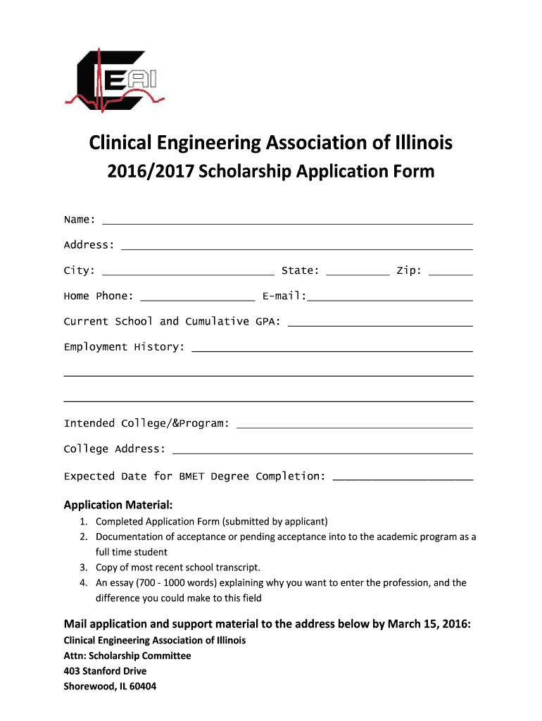 Clinical Engineering Association of Illinois 2016/$20172,500 Scholarship Program This scholarship is offered to promote awareness of and attract quality individuals to careers in the biomedical /
