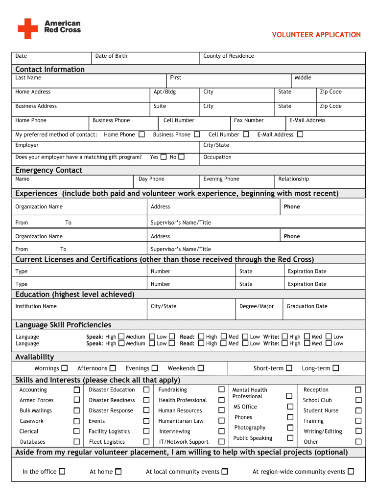 The Volunteer Application Form serves as a vital link, connecting individuals eager to contribute with various volunteer opportunities within the American Red Cross of Central and Western Oklahoma. This form gathers essential information, including personal details, availability, skills, and experiences, enabling the organization to match volunteers to suitable roles.