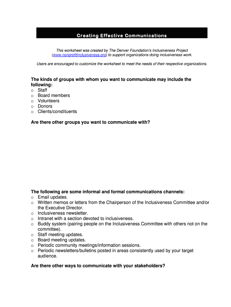 This worksheet was created by The Denver Foundations Inclusiveness Project (www.nonprofitinclusiveness.org) to support organizations doing inclusiveness work. Users are encouraged to customize the