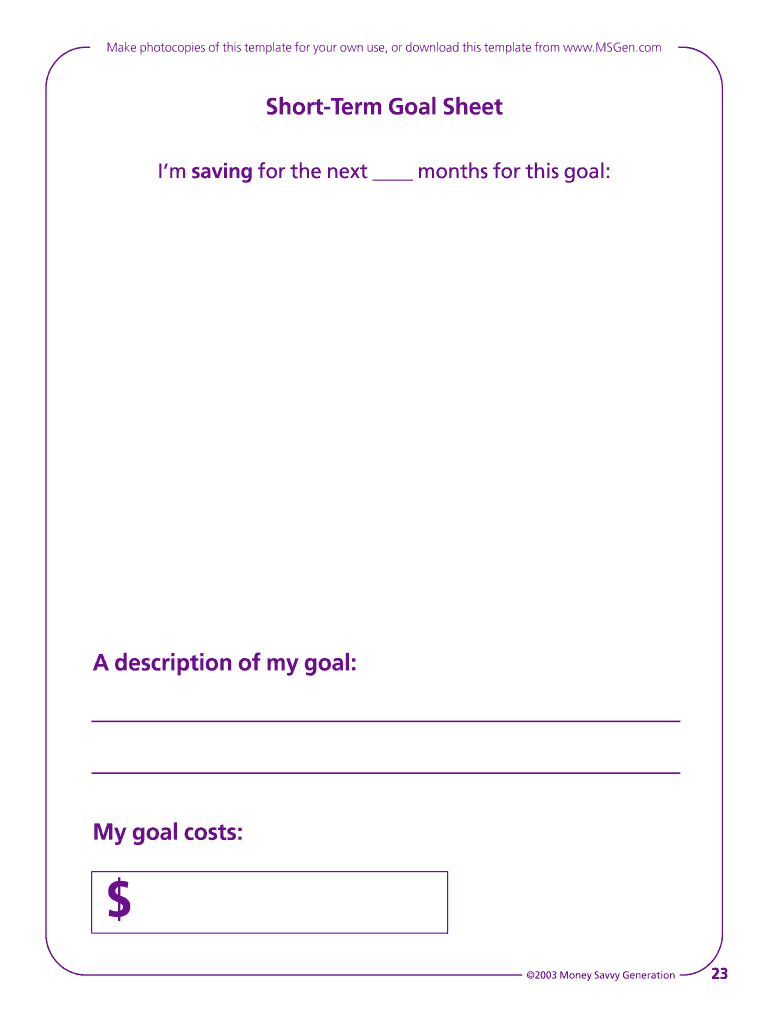 The Money Savvy Generation Goal Sheets are valuable financial goal templates that empower users to achieve financial organization. These templates serve to enhance personal finance management by aiding individuals in setting, tracking, and achieving their savings and spending goals. Financial planning is crucial, and these goal sheets emphasize the importance of creating a structured approach to managing finances.