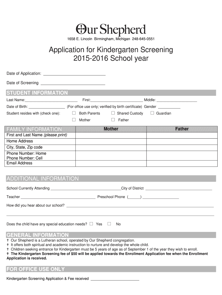 1658 E. Lincoln Birmingham, Michigan 2486450551 Application for Kindergarten Screening 20152016 School year Date of Application: Date of Screening STUDENT INFORMATION Last Name: First: Middle: Date