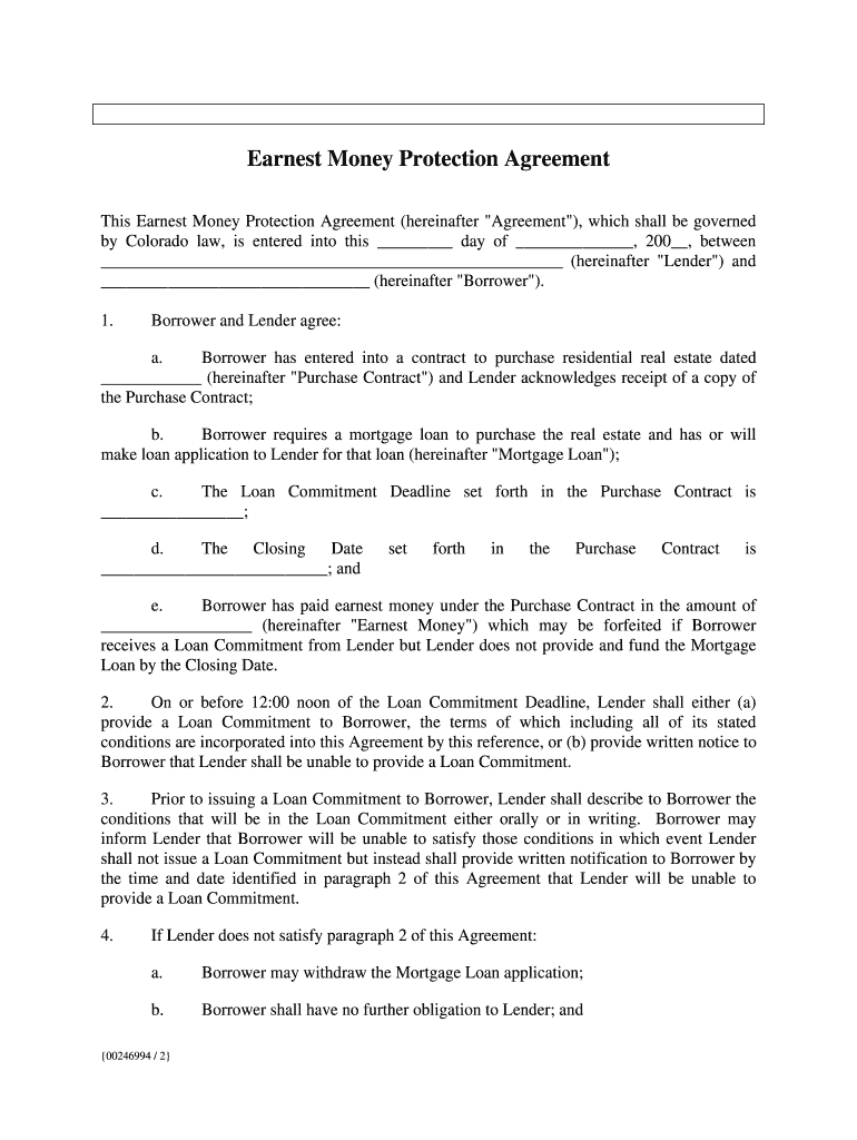 The Earnest Money Protection Agreement is a legal document used by Lenders and Borrowers to detail the terms surrounding earnest money deposits in Colorado real estate transactions.
